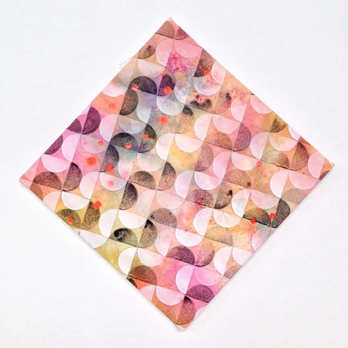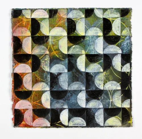 My practice has focused on organic patterning for two decades and more recently has juxtaposed intuitive processes of staining and mark making with geometry, using the grid and circle as a basic unit of pattern construction.