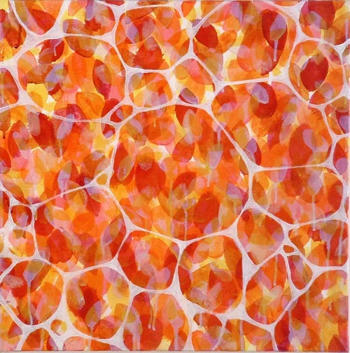 Each work is developed by repeating a shape which is dictated by the use of a particular brush using the grid to establish a common framework. Forms are repeated working generally with hues from light to dark as I relish in the organic development of each painting and the myriad of choices in directional movement of the brush, pigment, saturation and dilution of the oil and ink. Honeycomb, coral nets float across the surface unifying and linking fields of syrupy seed. The sublime qualities of the media and the supports which I choose to work on are central to my exploration of natural phenomena. I intend to pursue these working methods to develop my personal language of material and form.